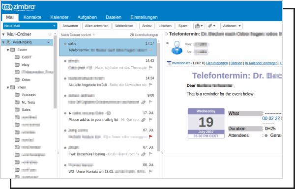 be very close and run your mail server in Germany, or in your company. Your colleagues work wonderfully with Zimbra with a fast web client, with your cell phone or tablet and also with a conventional Outlook.