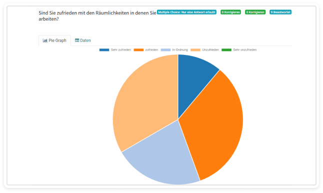 Each question and its responses can be analyzed both graphically and in tabular form. The type of question (multiple choice, number of responses, etc.) is also displayed in the analysis, making it easy to interpret the results.